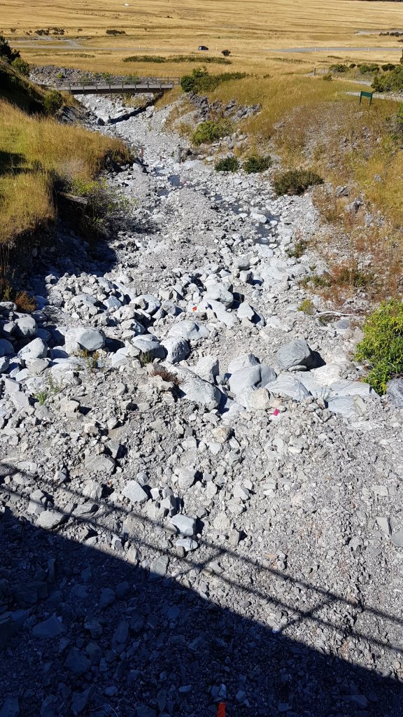 Photo – the riverbed that was supposed to be Stage 1, but by the following morning was awash, so stage abandoned. Note the pink marker flags where we would have had to run…
