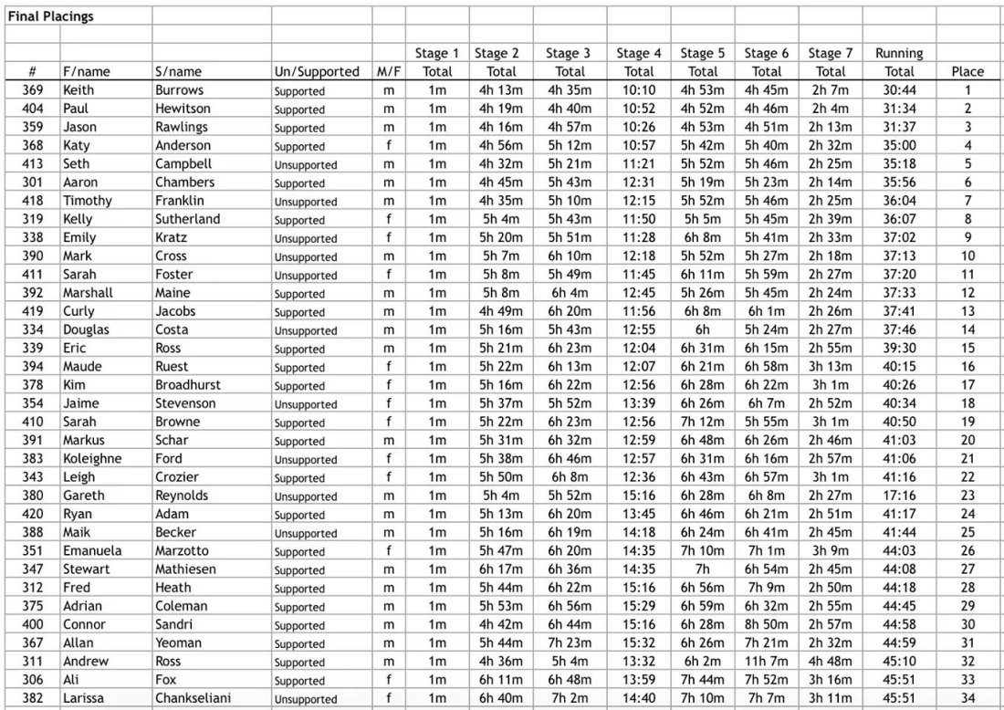 Eventually I made it, after more than 4 and a half hours. The race leaders had done it in just over two hours. Keith had held on for the overall win, smashing the previous record. Unfortunately for Jason, Paul had had another blinder, winning his third stage in a row. In doing so, he had overtaken Jason for second place overall. Massive kudos to Keith for setting an incredibly hot pace early on, and hanging on, but also credit to both Paul and Jason for their efforts chasing him all week.